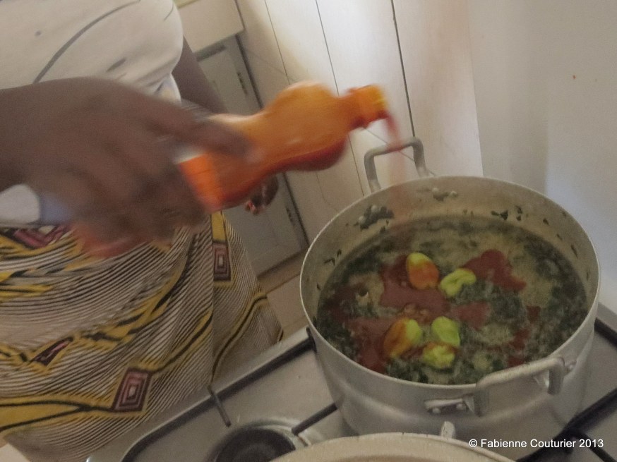 Remettez sur le feu, ajoutez un bon trait d’huile rouge, les piments broyés et d’autres entiers, les crabes, le poisson et un cube de bouillon.