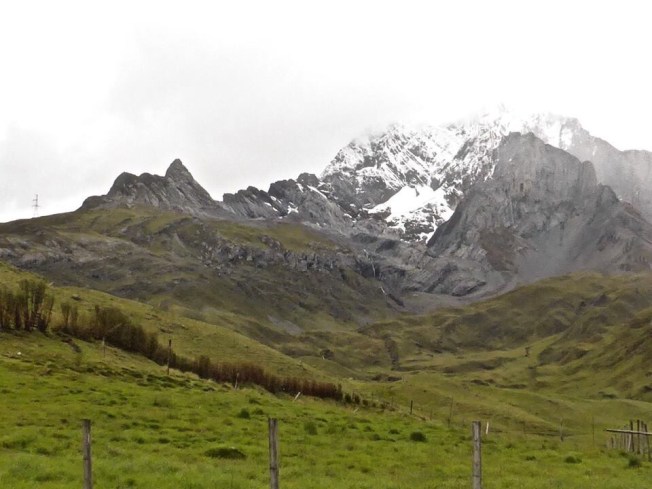 Nous avons quitté Caraz vers 6h30 vendredi matin, Maria-Isabel, Pedro, Vanessa (jeune vétérinaire stagiaire) et moi, direction Huaraz, où habite le collègue Andrés, que nous allions cueillir pour nous rendre tous ensemble à Huallanca, une petite ville nichée dans une vallée à 3540 m d’altitude, sur l’autre versant de la Cordillère. Ce n’est qu’à 190 km de Caraz, mais il faut quatre heures bien comptées pour s’y rendre. Ce n’est pas parce que la route n’est pas bonne, au contraire — c’est l’une des meilleures que j’aie vues jusqu’ici. Elle a été construite par Altamina, une société minière, qui a accepté de ne pas couper par le parc du Huascaran pour son tracé, si bien qu’on doit faire un assez long détour pour éviter de perturber ce milieu fragile.