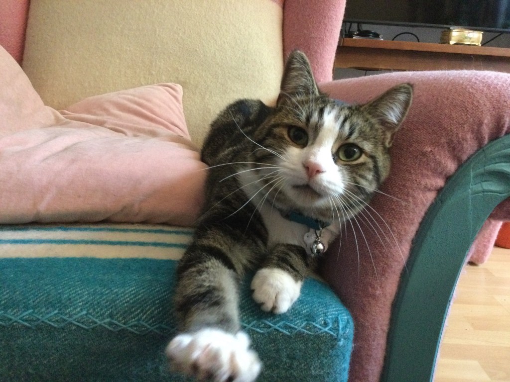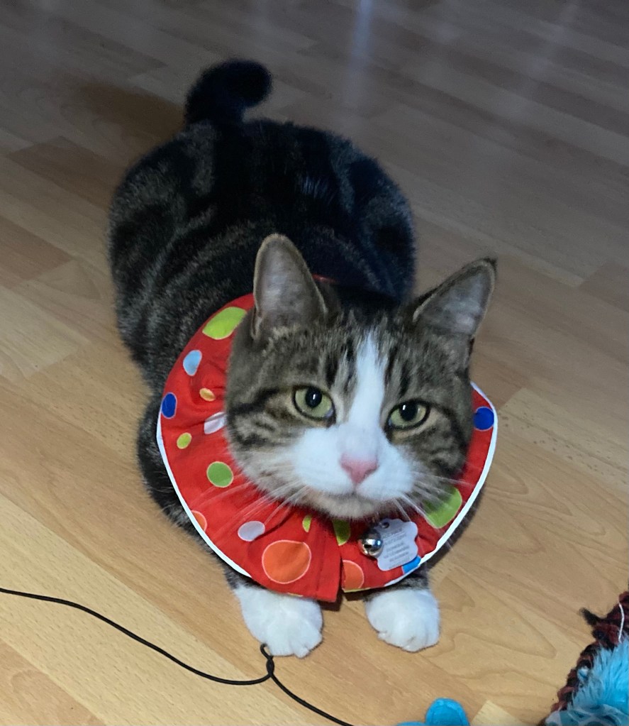 Sa collerette maudite marche même pas, lalalère! J’ai attrapé un autre oiseau ce matin, youpi! Elle était fâchée, la tatie, quand je lui ai rapporté la preuve de sa bêtise. Ça lui apprendra.