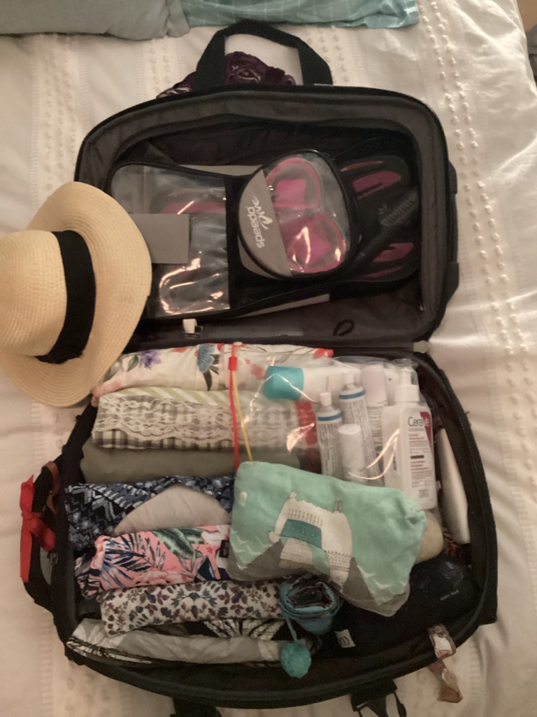 J’ajoute mes palmes et mon tuba, bien sûr – oui, ça tient dans mon bagage de cabine, je les ai achetés pour ça.