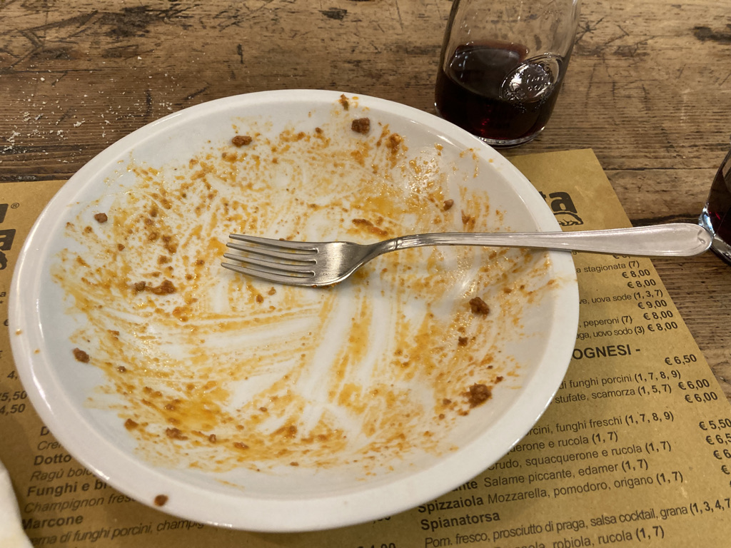 J’ai au moins réussi à faire rire celui qui m’a confisqué ma guanciale et mon prosciutto quand je lui ai dit que je reviendrais fouiller dans les poubelles pendant la nuit.