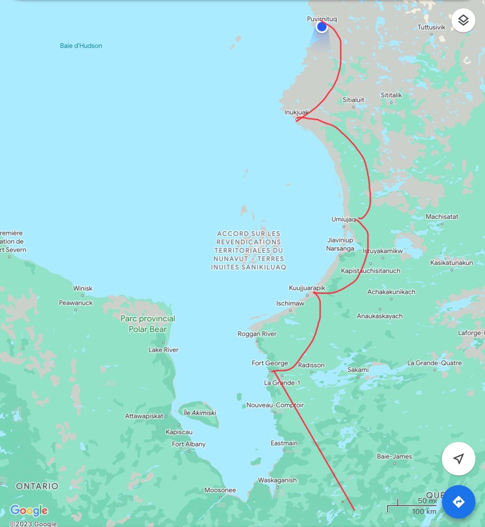 Tout a commencé doucement et s’annonçait comme une affaire de rien. On a pris un jet à Puvirnituk. Un Boeing! Mon petit Charlie se demandait bien pourquoi cet avion n’avait pas d’hélices. J’aurais aimé pouvoir lui expliquer la différence entre un avion à hélices et un avion à réaction, mais mes compétences, évidemment, ne vont pas jusque-là.