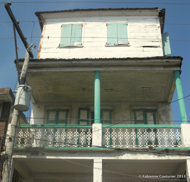 Ici, il ne reste apparemment qu’une seule maison de bois de type caribéen, comme celles qu’on voit encore à Cuba ou en Haïti: de plain-pied, d’un seul étage, faites en planches plus ou moins disjointes, couvertes de tôle ondulée, avec des persiennes et une petite galerie. Je suis tombée dessus par hasard aujourd’hui – enfin, sur ce qu’il en reste. Et quelque chose me dit que, si je reviens l’an prochain, il n’en subsistera plus rien.